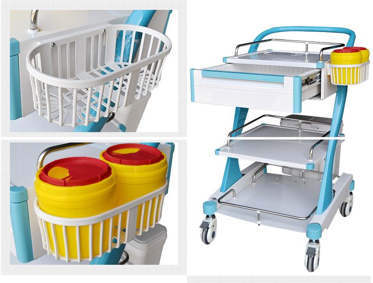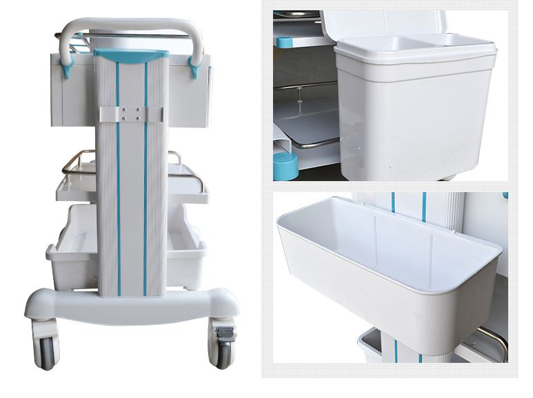 Cuenta con varias bandejas ajustables para acomodar instrumentos, insumos y equipos pequeños, además de espacios dedicados para almacenamiento organizado. Incluye ruedas giratorias de alta calidad que facilitan el desplazamiento suave incluso en pisos clínicos, con frenos incluidos para mantener el carro fijo durante el uso.